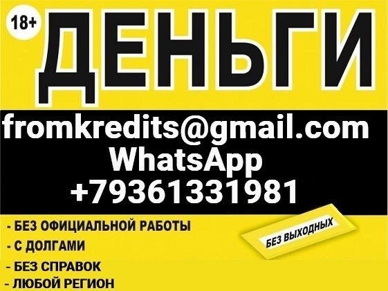 Работаем с любой кредитной историей и просрочками. Во всех городах РФ. Без залога, справок и отказа. Свои налаженные каналы и связи на необходимом уровне. Не берем предоплату за свои услуги. Кредитное предложение не предусматривает обеспечения и поручительства. От Вас требуется постоянная прописка в РФ, возраст от 18 лет, паспорт и второй дополнительный документ. Предоставляем гарантии. Полная информация по запросу на электронную почту fromkredits@gmail. com или звоните по телефону и WhatsApp +79361331981