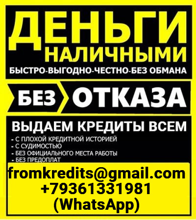 Кредит наличными без подтверждения дохода, занятости и поручителей! Любые суммы до 5 млн. рублей на различные цели. За подготовку недостающих документов оплаты не берем! Только выгодные условия с минимальными требованиями. Кредитная история допускается любая (от нулевой до черного списка). Возрастные ограничения 18-65 лет. Работаем с регионами! Предоставляем гарантии, которые другие предоставить не могут! Обращайтесь, если уверены в своей платёжеспособности в любое время! Заявки принимаем по электронной почте fromkredits@gmail. com и контактному телефону +79361331981 (WhatsApp).