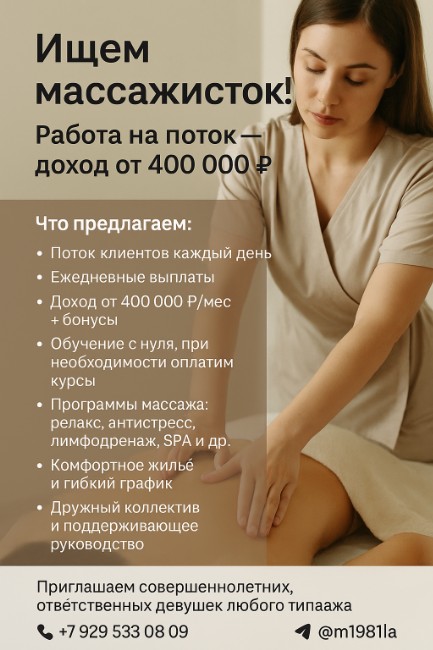 Мы — крупная сеть салонов с опытом более 10 лет, работаем в разных сегментах: от доступного формата до премиум-уровня с программами от 20 000 ₽ и выше. У нас вы не столкнётесь с простоями: налаженные Telegram-каналы, готовая база клиентов и проверенные рекламные посты обеспечивают стабильную загрузку каждый день. Работа полностью анонимная — без публикации личных фото и видео в интернете, с гарантией безопасности и профессиональной поддержкой на всех этапах. Мы предлагаем ежедневные выплаты, доход от 400 000 ₽ в месяц плюс чаевые, обучение с нуля (курсы оплачиваем), разнообразные программы массажа — от релакса и SPA до антистресса и эротических техник, комфортное жильё, гибкий график, дружный коллектив и лояльное руководство. Рассматриваем совершеннолетних, ответственных девушек любого типажа — опыт не обязателен, важны желание работать и зарабатывать. Связаться с нами можно по телефону или WhatsApp: +7 968 051-27-34, Telegram: @Mila19la68 (Мила).
