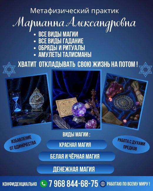 Вы ищете ответы на сложные вопросы? Чувствуете, что жизнь зашла в тупик? Я, Марианна Александровна, опытный метафизический практик, помогу вам разобраться в жизненных трудностях и найти верный путь к счастью и благополучию.