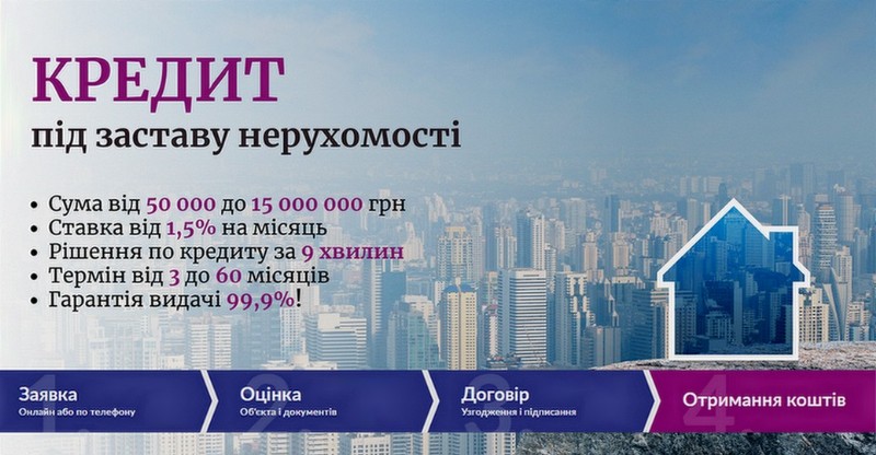 Ви можете отримати гроші під заставу квартири, приватного будинку, комерційної нерухомості або ділянки в Києві та інших регіонах. Рішення ухвалюється протягом 9 хвилин, і вже в той же день ви можете мати гроші на рахунку.