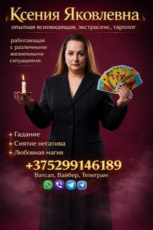 Ксения Яковлевна — опытная ясновидящая, экстрасенс, таролог, работающая с различными жизненными ситуациями. Принимает обращения как лично, так и дистанционно. Консультации проводятся конфиденциально, с индивидуальным подходом к каждому человеку.