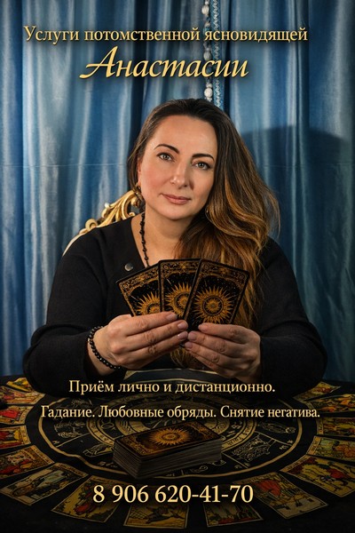 Анастасия — ясновидящая и таролог, работающая с различными жизненными ситуациями. Принимает в Москве лично, а также проводит дистанционные консультации. Все обращения рассматриваются индивидуально и строго конфиденциально.