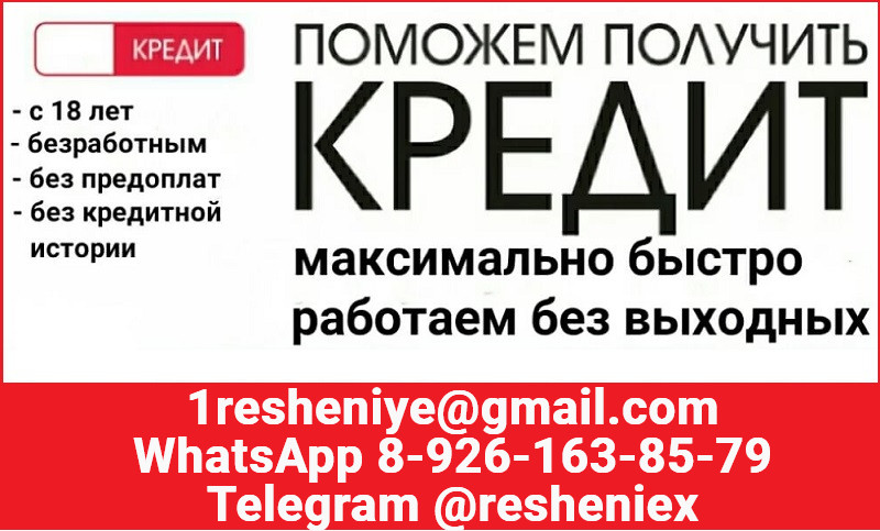 Доступный кредит на законных условиях. Обращайтесь к нам и получите кредит в любой сложной ситуации, при любой кредитной истории и наличии долговых нагрузок. Официального трудоустройства и подтверждения занятости не запрашиваем. Работаем строго без предоплаты в любом виде, без залога и поручителей. Нет скрытых платежей, комиссий и страховок. Минимум документов. Рассмотрение в день подачи заявки. Обращайтесь на электронную почту 1resheniye@gmail. com; WhatsApp 8-926-163-85-79; Telegram @resheniex