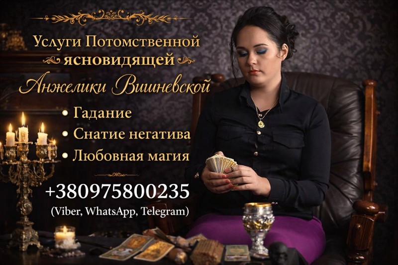 Анжелика Вишневская — потомственная практикующая ясновидящая, которая помогает определить источник проблемы и безопасно устранить его. Работа проводится деликатно и без запугивания, с индивидуальным подходом к каждой ситуации. Консультации возможны как при личной встрече, так и дистанционно — по фото.