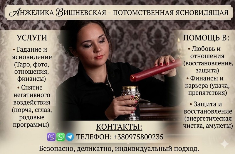 Анжелика Вишневская — потомственная практикующая ясновидящая, которая помогает определить источник проблемы и безопасно устранить его. Работа проводится деликатно и без запугивания, с индивидуальным подходом к каждой ситуации. Консультации возможны как при личной встрече, так и дистанционно — по фото.
