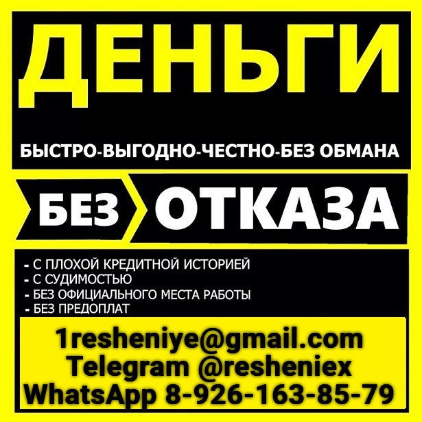 Выгодный кредит с любой кредитной историей в вашем городе! Оперативно, надежно, без предоплаты. Берёмся даже за самые запущенные ситуации, ценим каждого клиента. Работаем с негативной кредитной историей, действующими кредитами и просрочками, с высокой финансовой нагрузкой, отсутствием официального источника дохода, без подтверждения платежеспособности. Без отказа и вложений, с подписанием всех необходимых документов. Предоставляем гарантии! Отправляя заявку сейчас, у Вас есть возможность получить кредит уже сегодня. Консультация наших специалистов бесплатная. Заявки принимаем на электронную почту 1resheniye@gmail. com; Telegram @resheniex или WhatsApp 8-926-163-85-79
